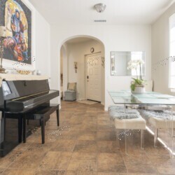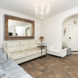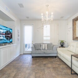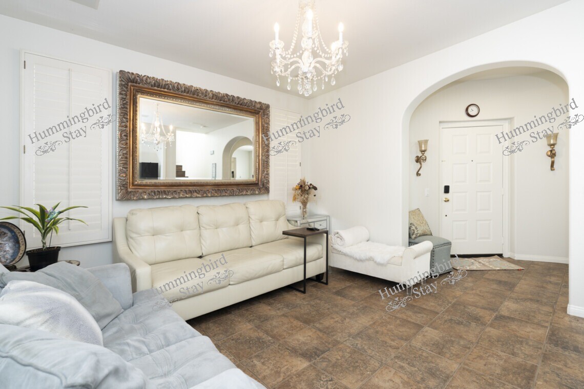 Step through the arched entryway into a sun-drenched open-concept living and dining area adorned with warm ceramic tile floors, plantation shutters, and a stunning crystal chandelier. The living room features a plush leather sectional, a 65″+ flat-screen TV in a custom built-in entertainment niche, and an ornate gold-framed baroque mirror that adds depth and elegance to the space.