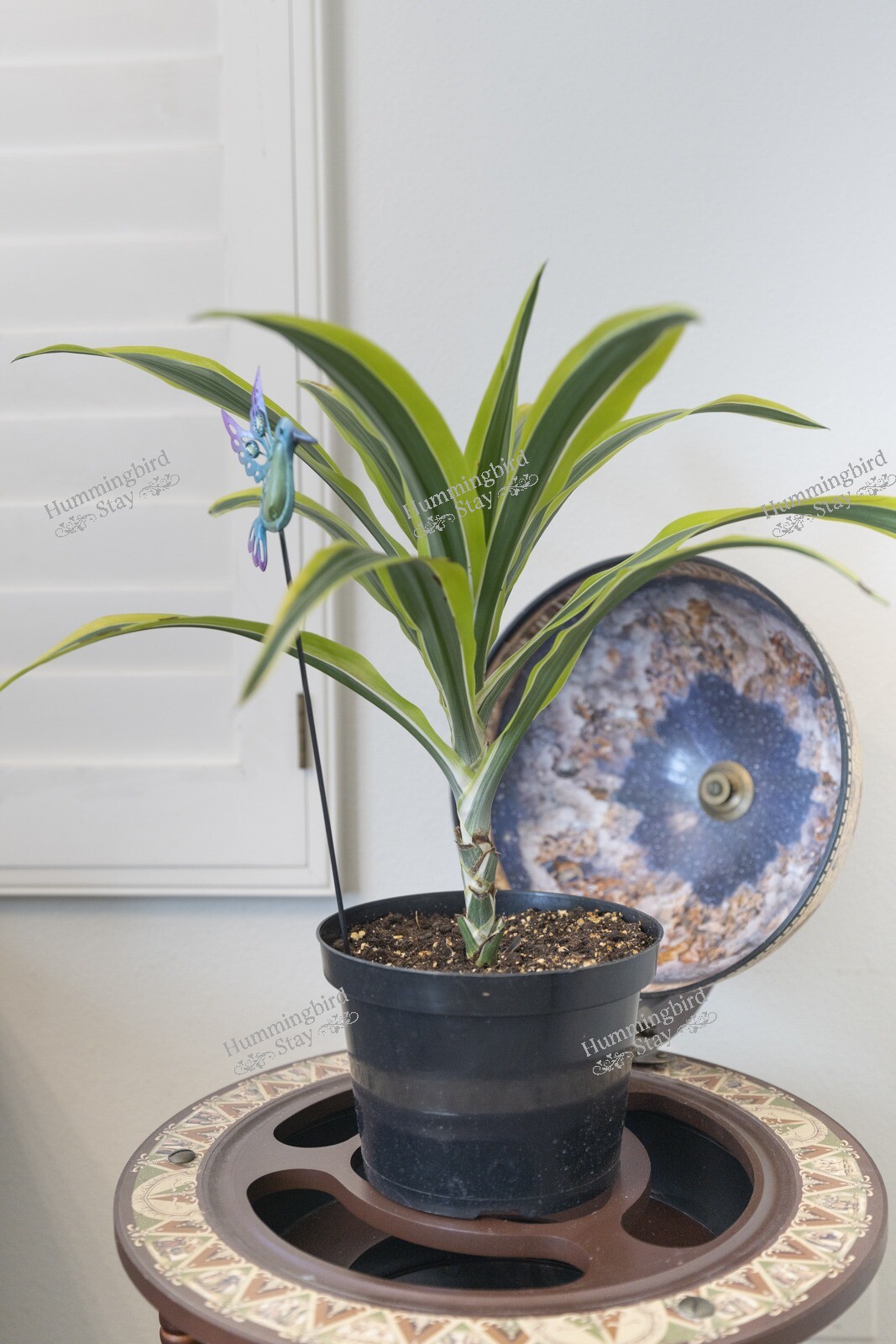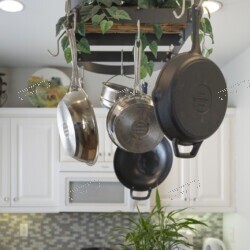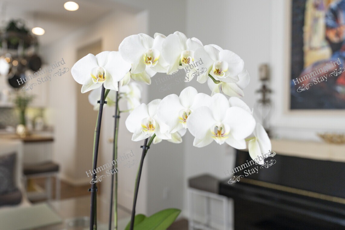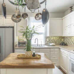 The dining area is a showpiece — a modern glass-top table with acrylic legs sits beneath a crystal flush-mount fixture, complemented by a glossy black upright piano and vibrant original artwork. The gourmet kitchen boasts white raised-panel cabinetry, mosaic glass tile backsplash in green and gold tones, a stainless steel Samsung refrigerator, and a charming hanging pot rack with trailing greenery.