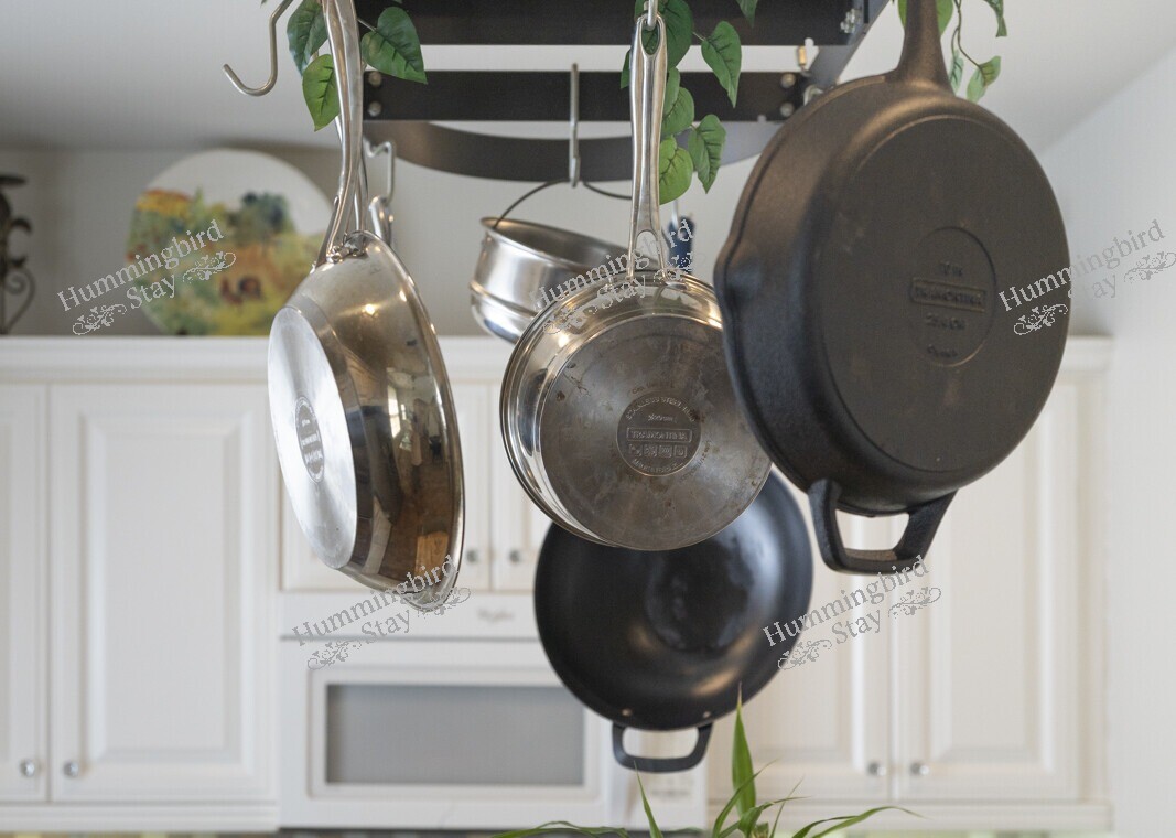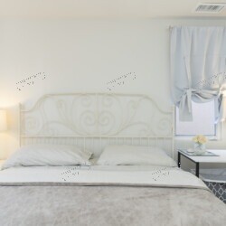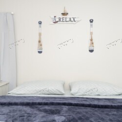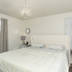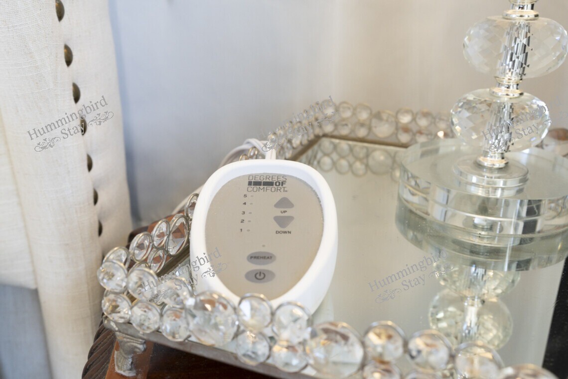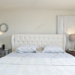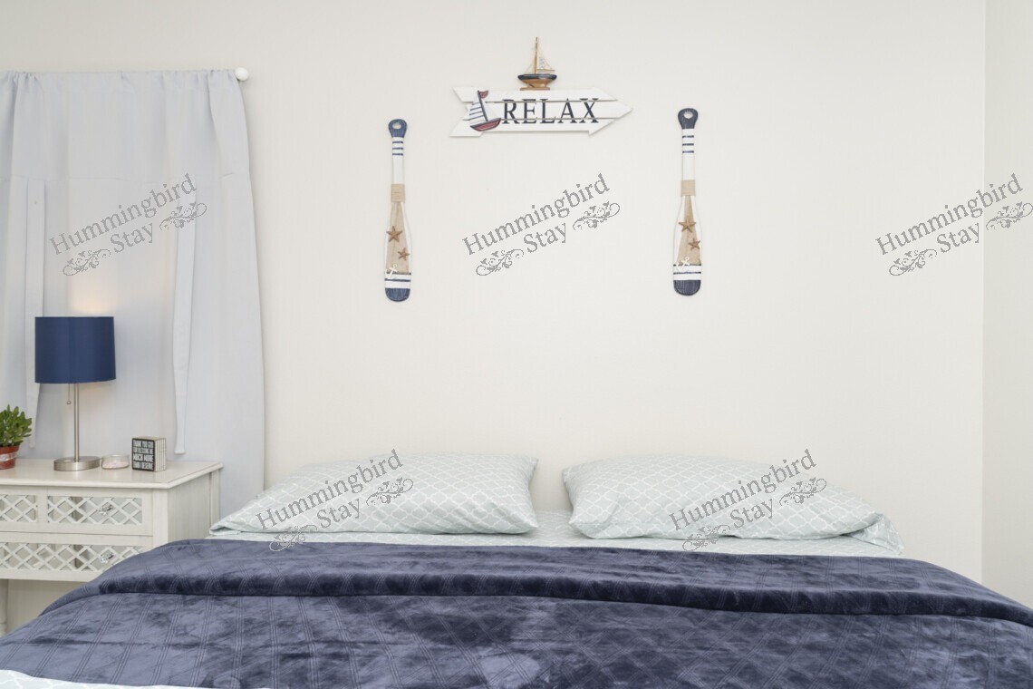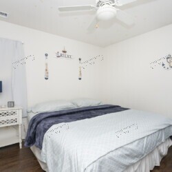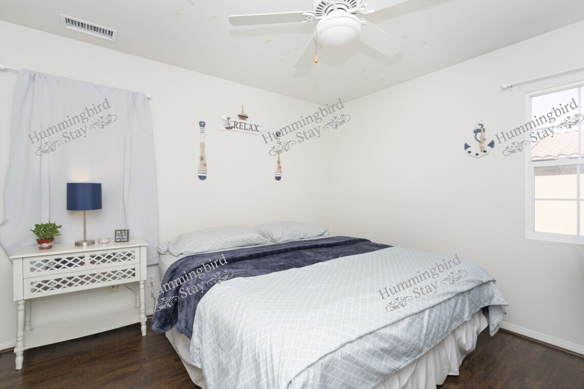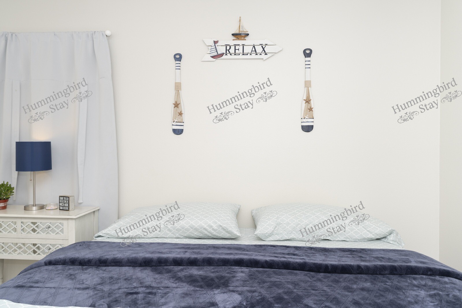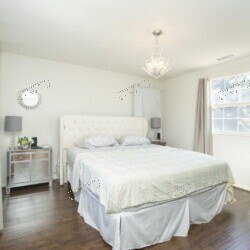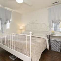 Upstairs, rich dark hardwood floors lead to three thoughtfully designed bedrooms. The primary suite is pure glamour — a king-size bed with a cream tufted wingback headboard, mirrored nightstands, crystal-base lamps, and a breathtaking Murano-inspired crystal branch chandelier. A second bedroom channels relaxed coastal vibes with a nautical theme, decorative oars, and a navy-and-seafoam color palette. The third bedroom charms with a romantic wrought-iron bed frame, balloon curtains, and shabby-chic styling.