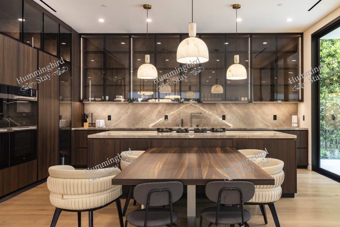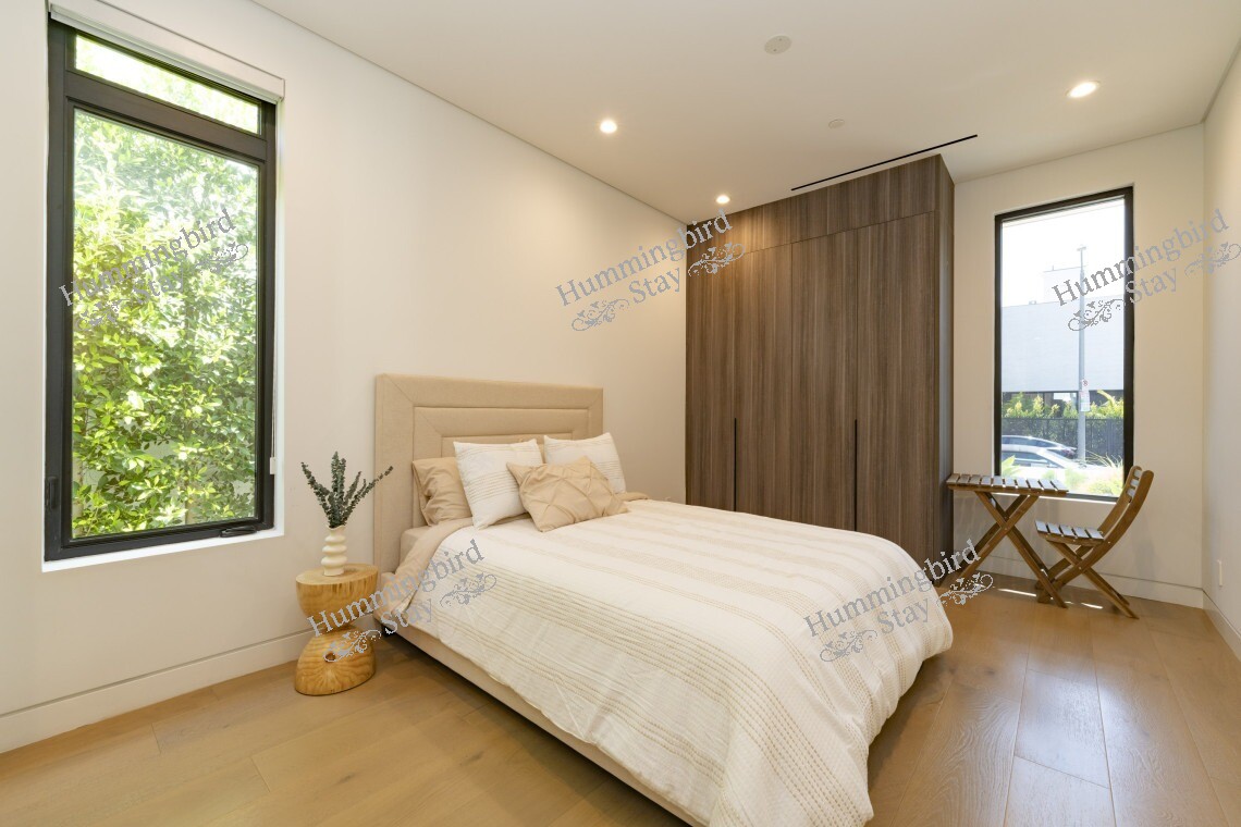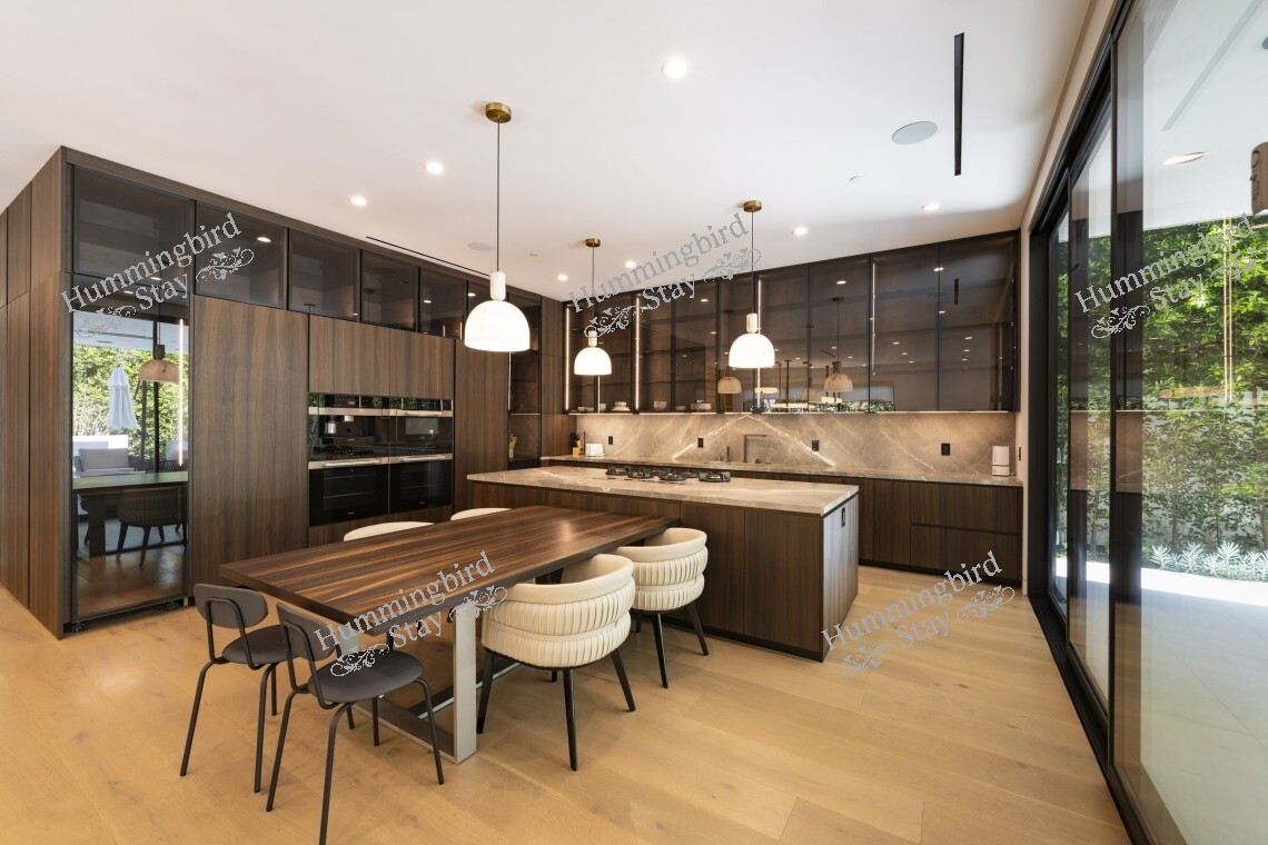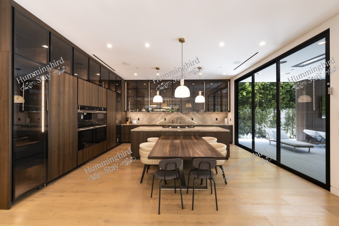 This sophisticated home features modern amenities including air conditioning, gourmet kitchen with premium appliances, laundry facilities, WiFi, and stunning outdoor entertaining spaces. The tree-lined streets and upscale neighborhood provide the perfect backdrop for experiencing the best of Los Angeles living.