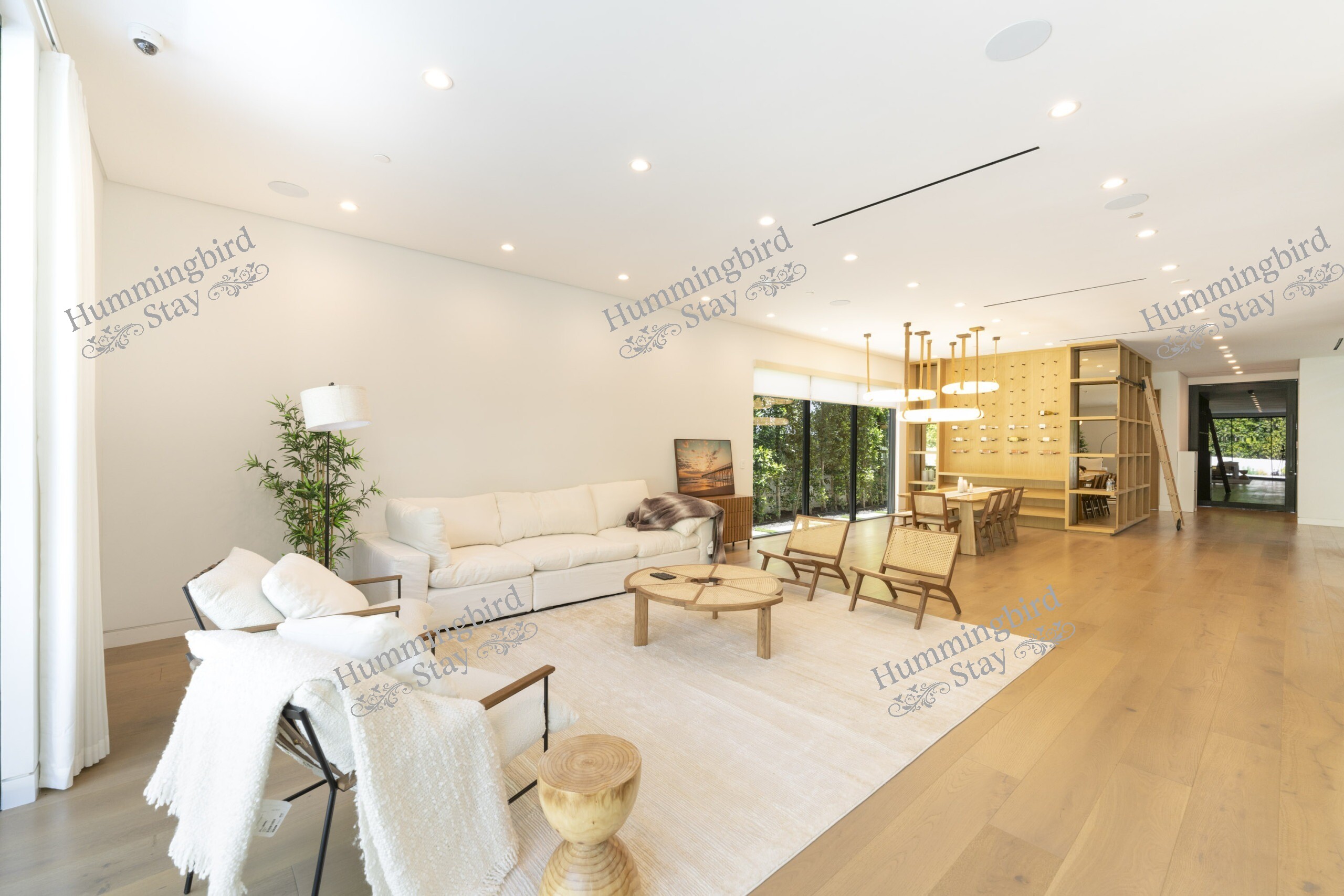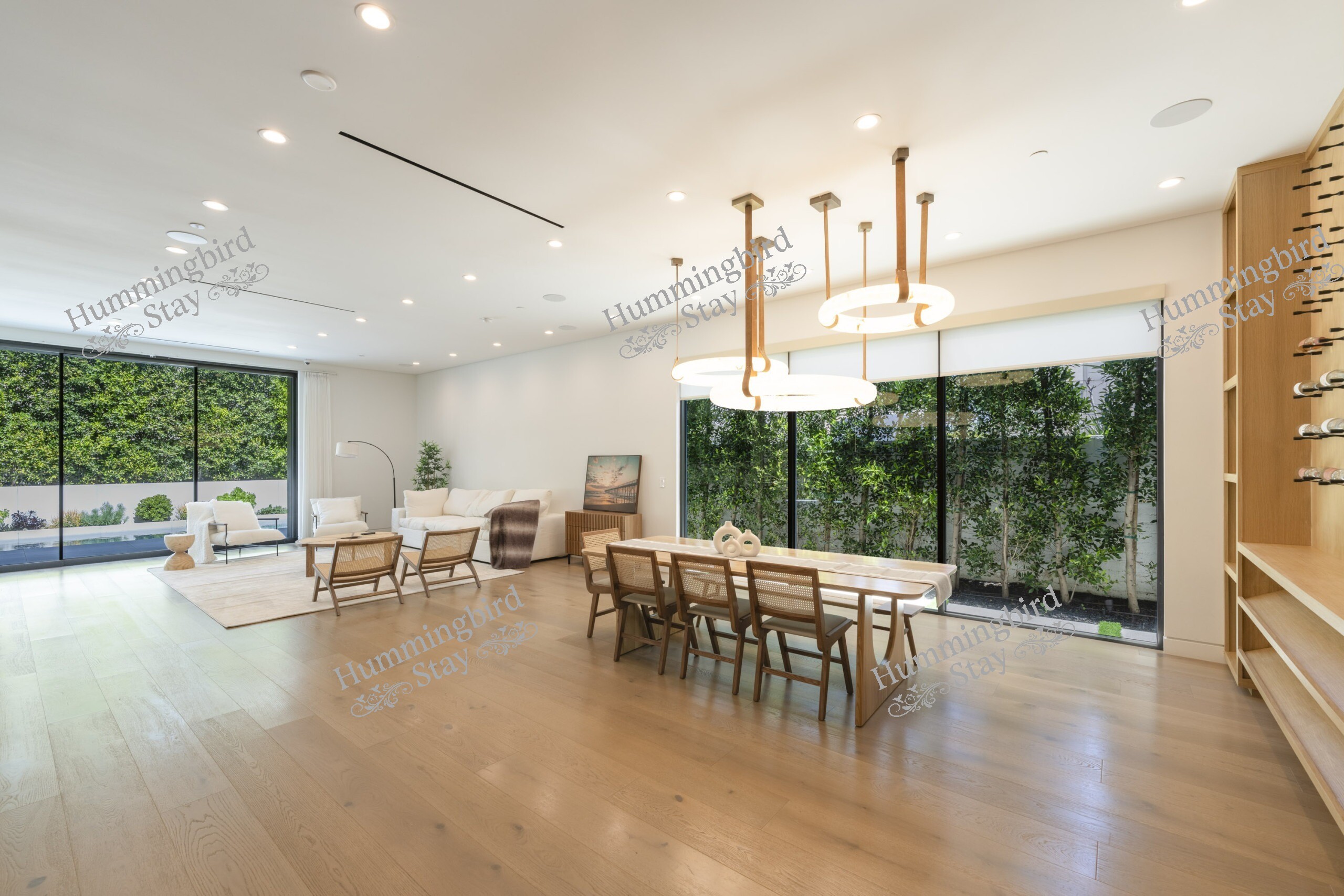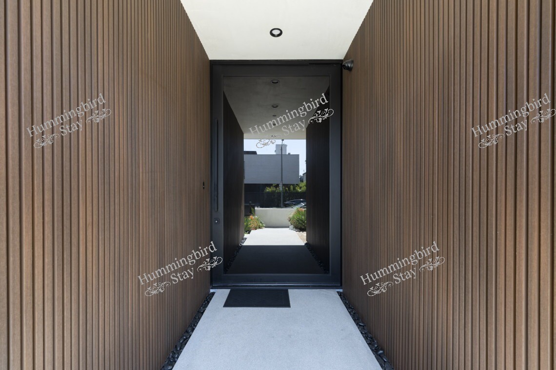 This sophisticated home features modern amenities including air conditioning, gourmet kitchen with premium appliances, laundry facilities, WiFi, and stunning outdoor entertaining spaces. The tree-lined streets and upscale neighborhood provide the perfect backdrop for experiencing the best of Los Angeles living.