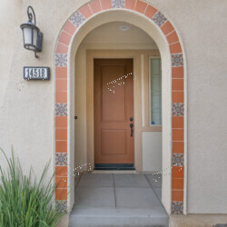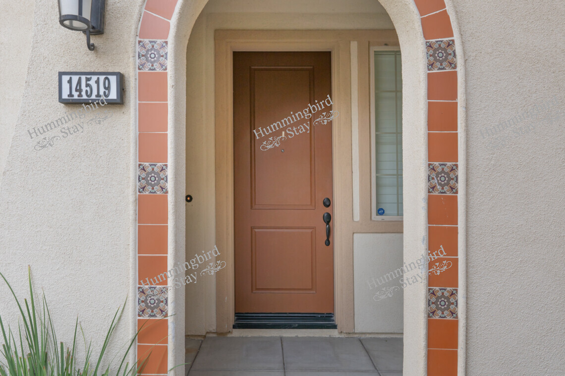 Front Entry: A charming covered porch with Mediterranean architectural details — decorative arched doorway with terracotta tile trim, a wrought iron Juliet balcony, and lush drought-tolerant landscaping including bird of paradise and ornamental grasses.