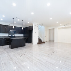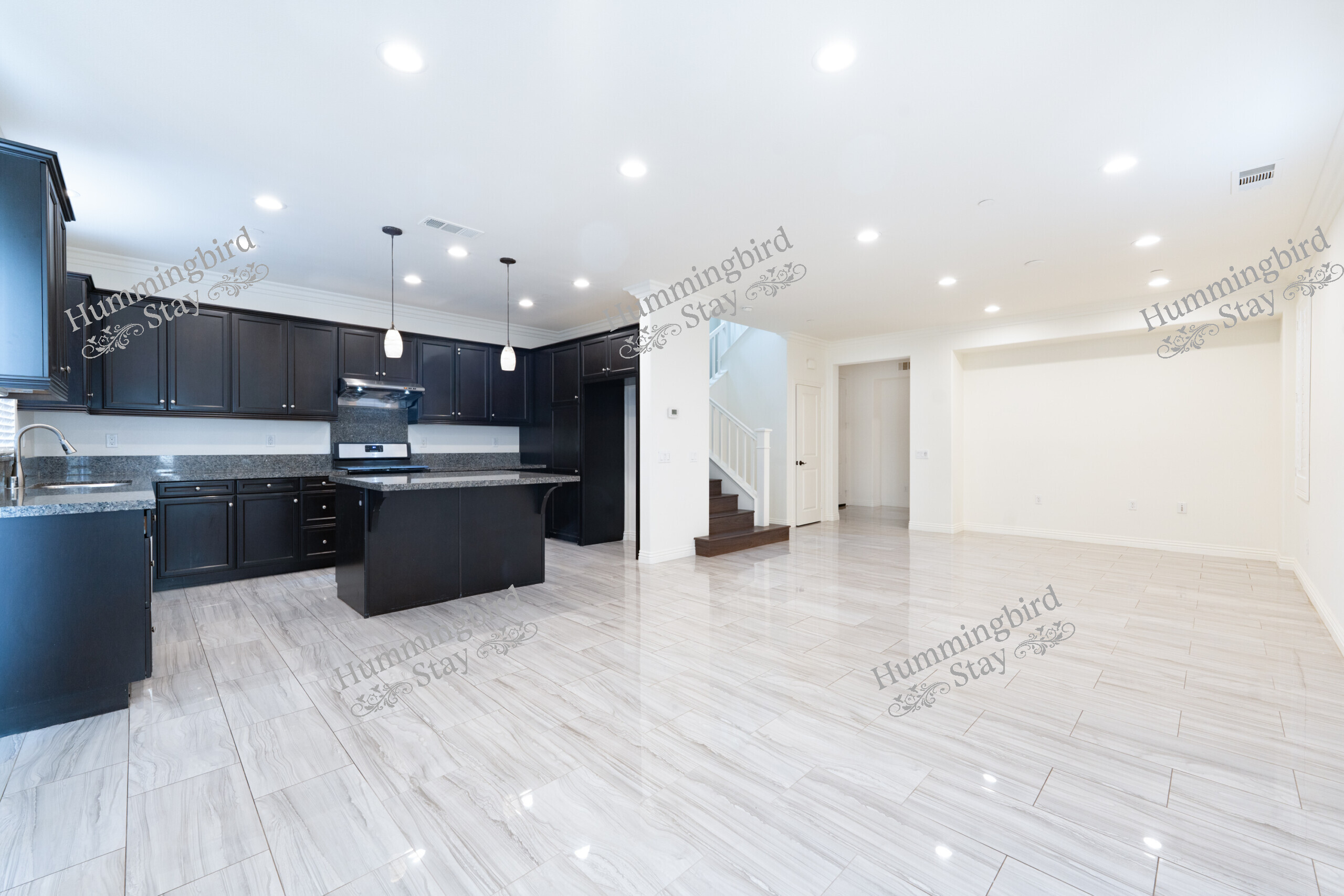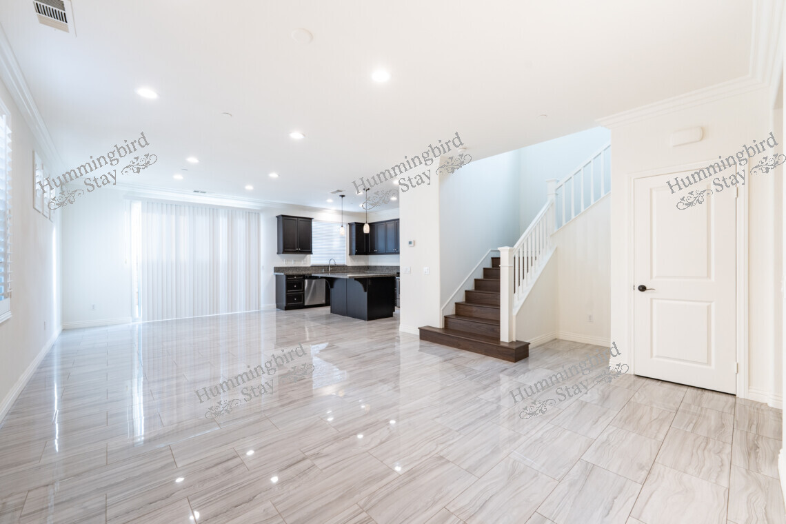 Open-Concept Main Level: The heart of the home features large-format polished porcelain tile flooring with an elegant marble-inspired veining that flows seamlessly from entry to kitchen to living area. Abundant recessed LED lighting and bright white walls create an airy, sunlit atmosphere.