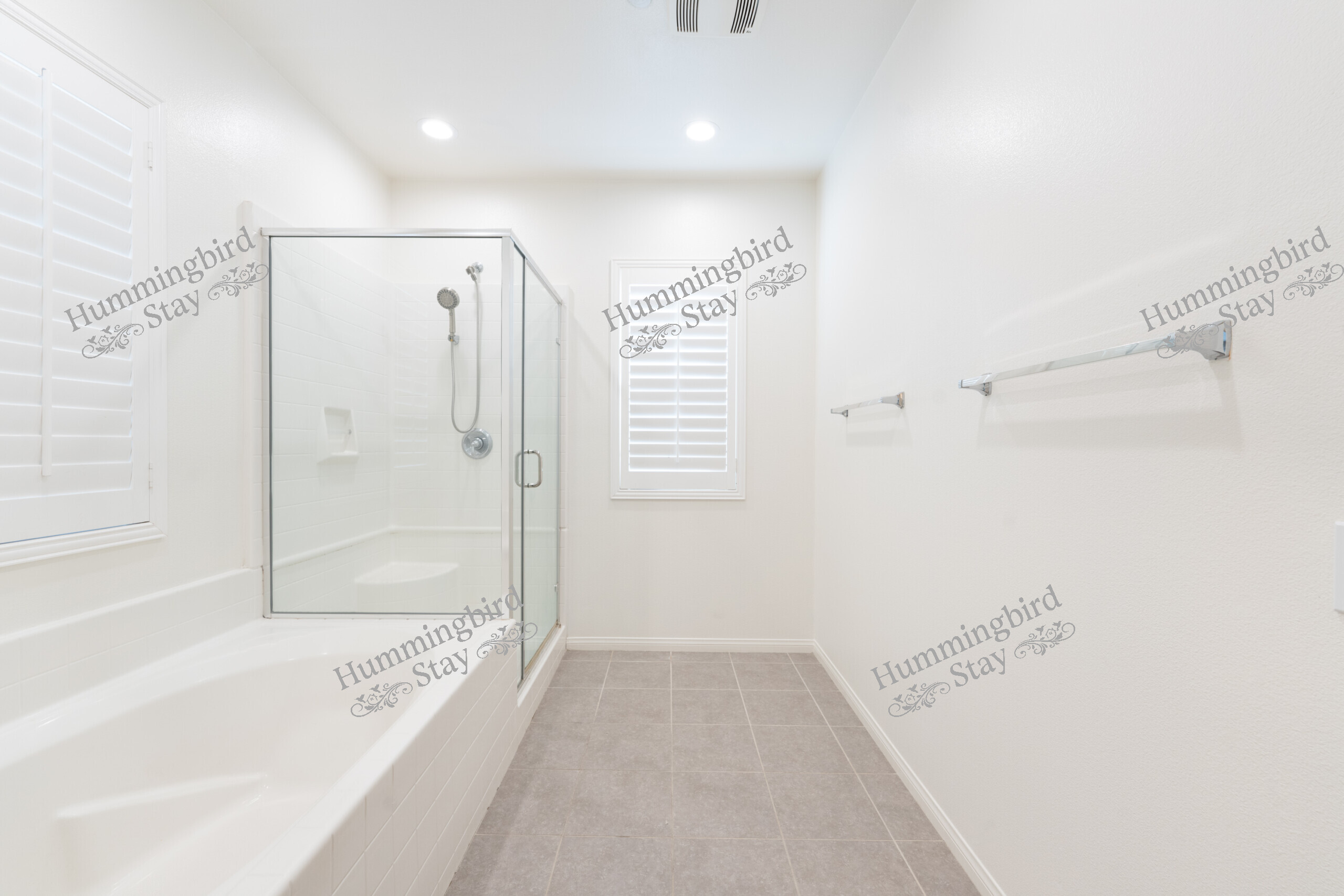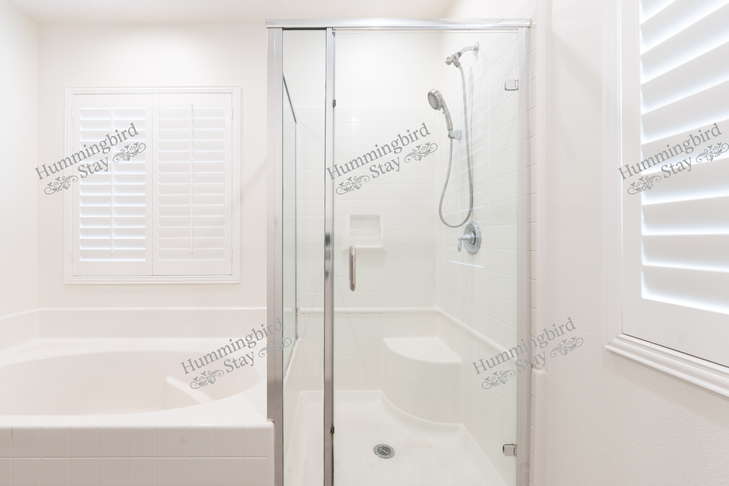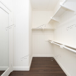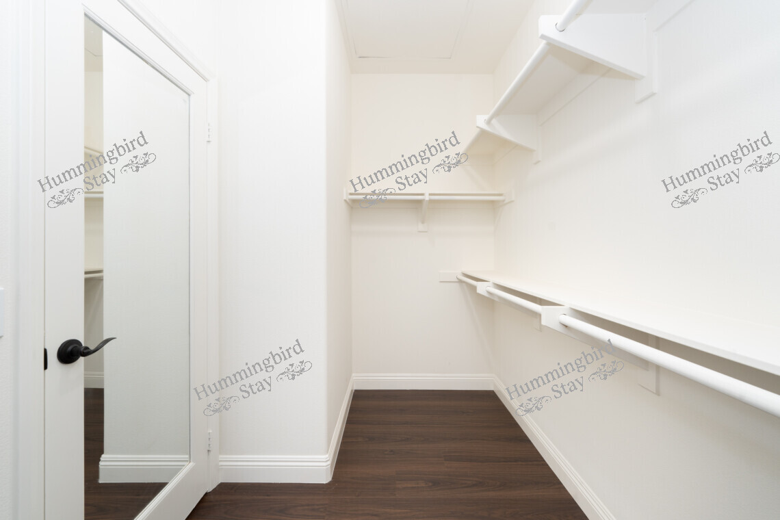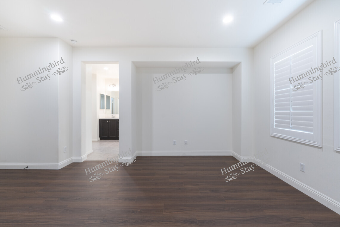 Master Suite: A spacious retreat with dark walnut-toned wood-look plank flooring, a built-in recessed alcove, and white plantation shutters for privacy and light control. The en-suite master bathroom features a double-sink vanity with espresso cabinetry, white quartz countertops, polished chrome fixtures, and a bathtub/shower combination with a frameless glass partition and subway-style tile surround. A generous walk-in closet with built-in shelving and double hanging rods provides ample storage.