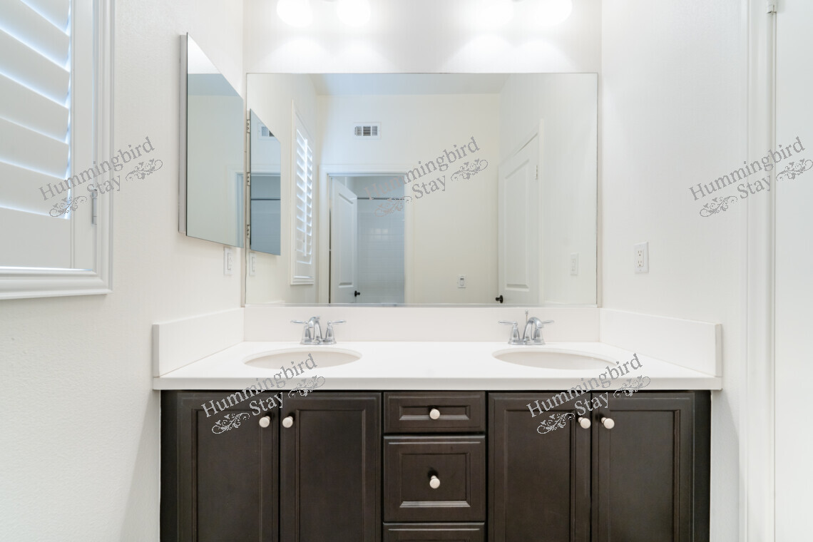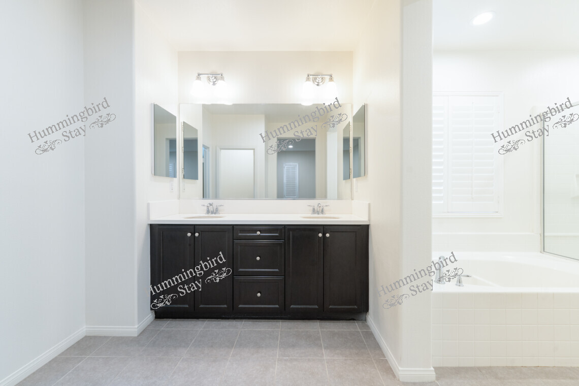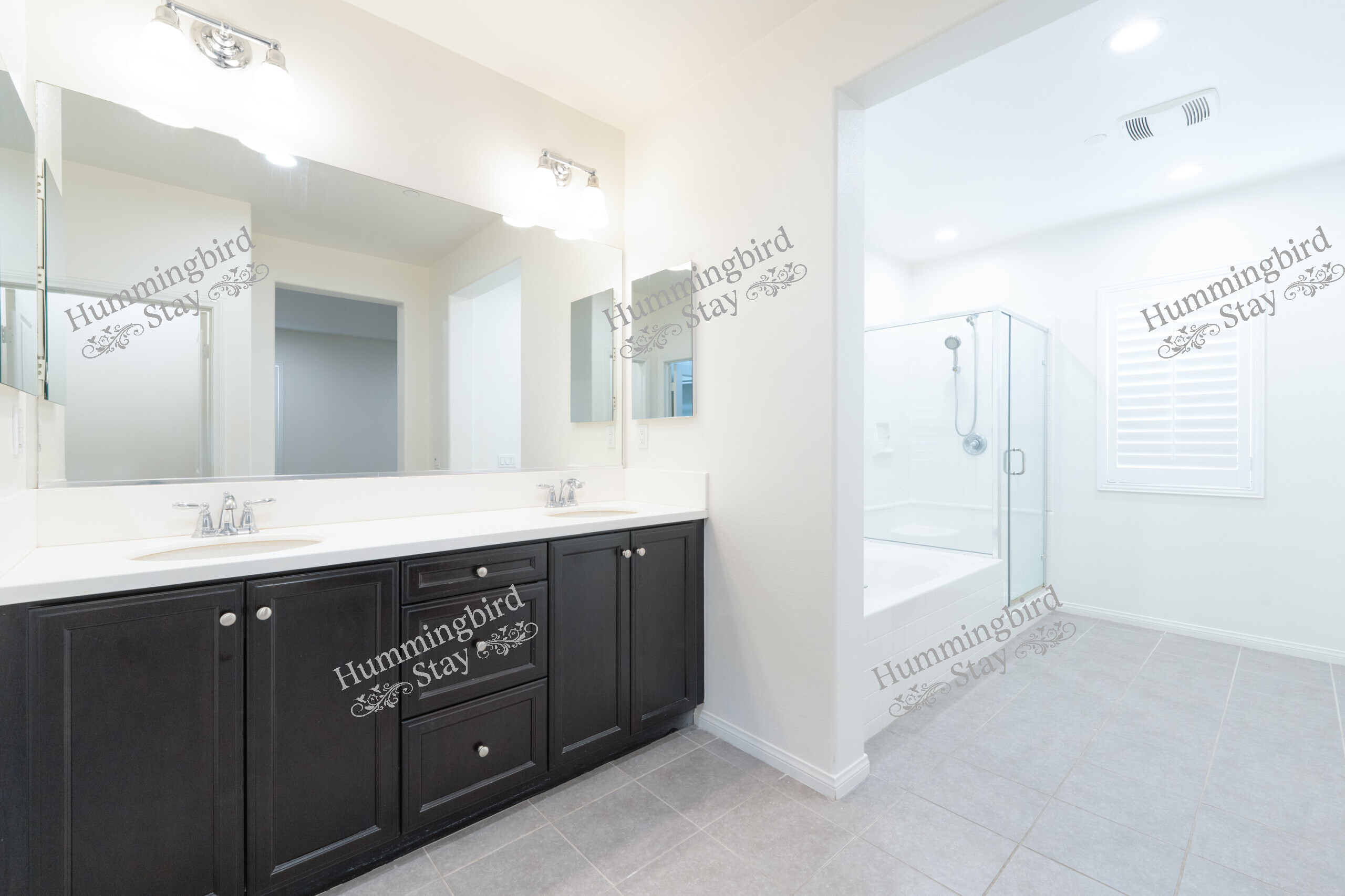 Secondary Bathroom: Features a double-sink espresso vanity with white countertops, chrome fixtures, a large frameless mirror, and a tub/shower combination with glass enclosure.