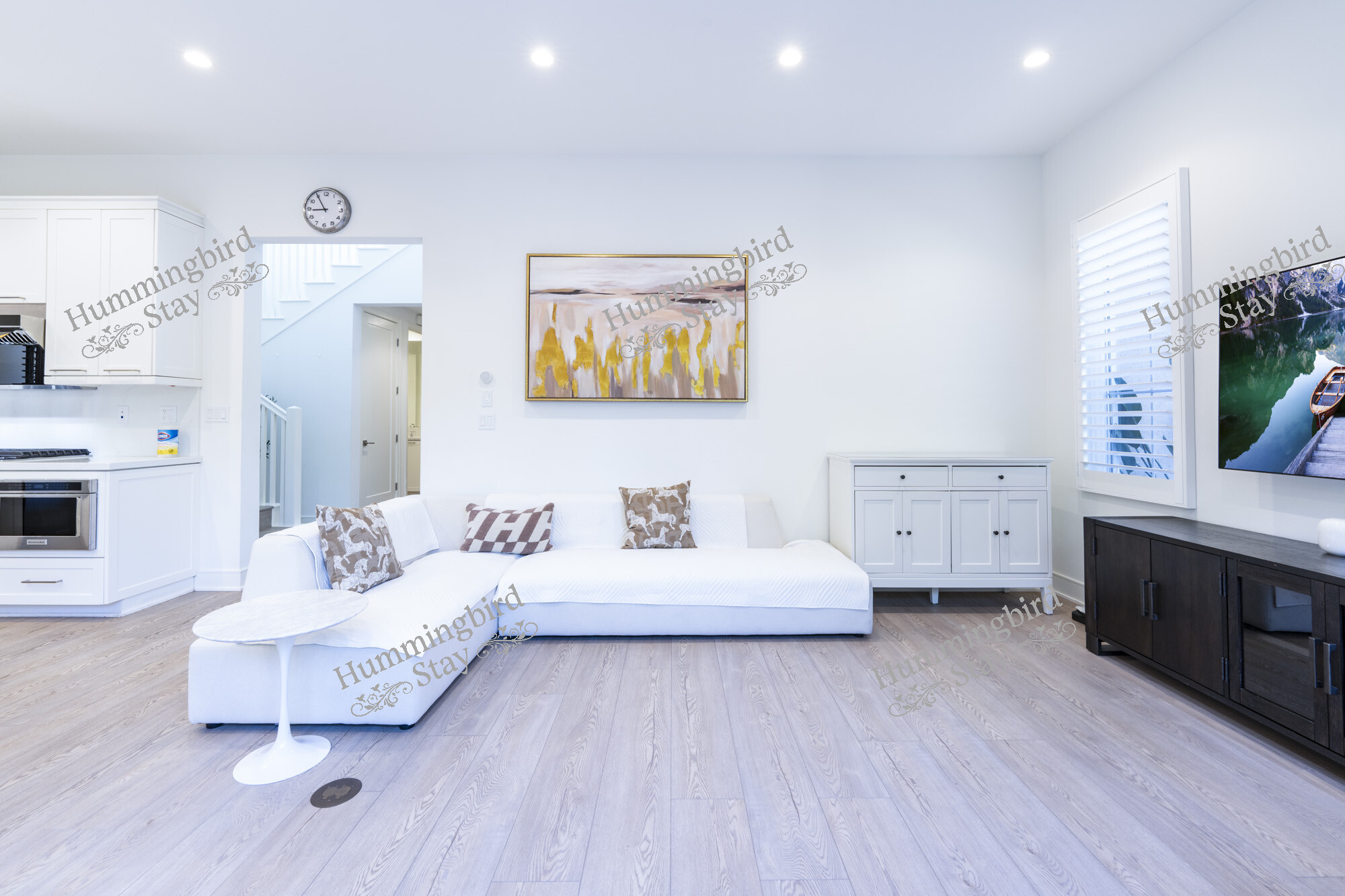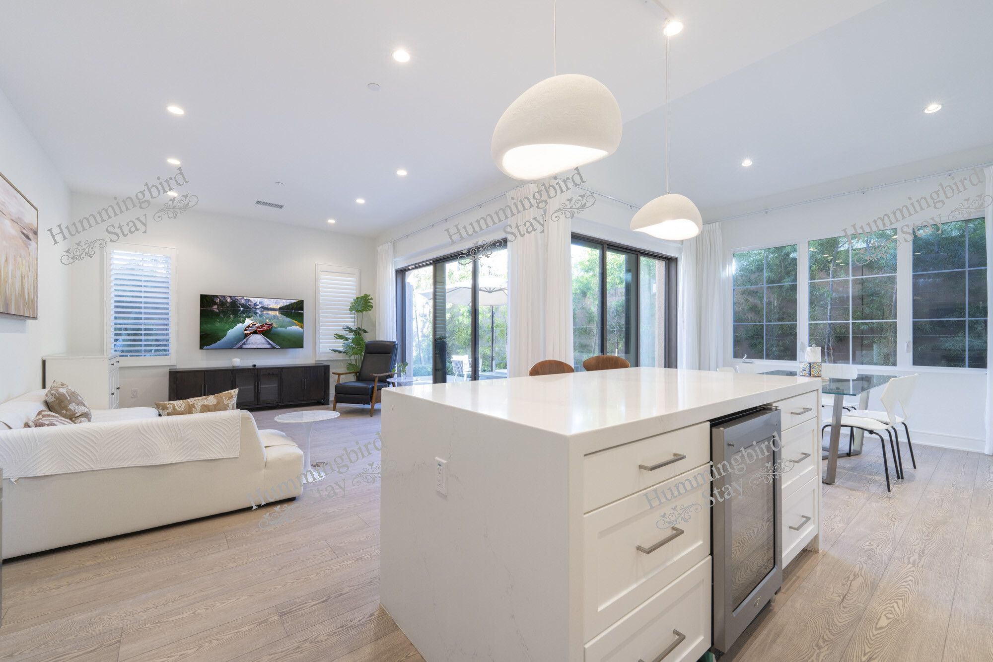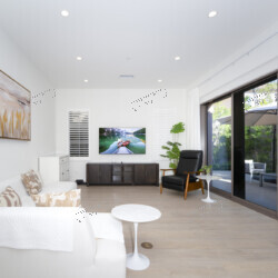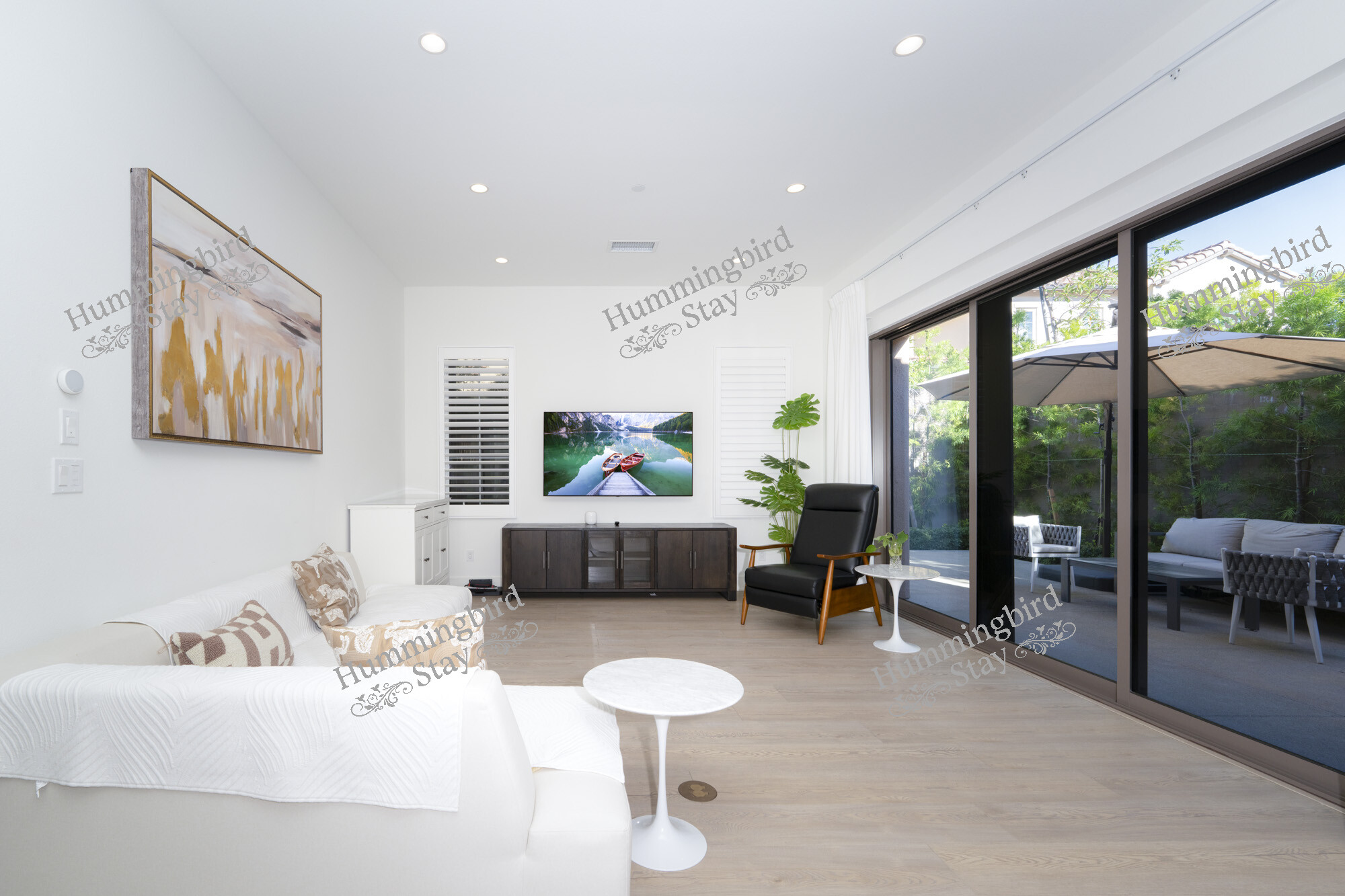 Open-Concept Great Room — Step through the striking black panel front door into a sun-drenched living area anchored by wide-plank whitewashed hardwood floors, recessed LED lighting, and white plantation shutters throughout. A plush white sectional with mid-century modern accent chairs invites you to settle in, while black-framed sliding glass doors open to a private patio — blurring the line between indoors and out. The color palette is intentionally restful: crisp whites, warm taupes, and walnut wood accents that carry from room to room.