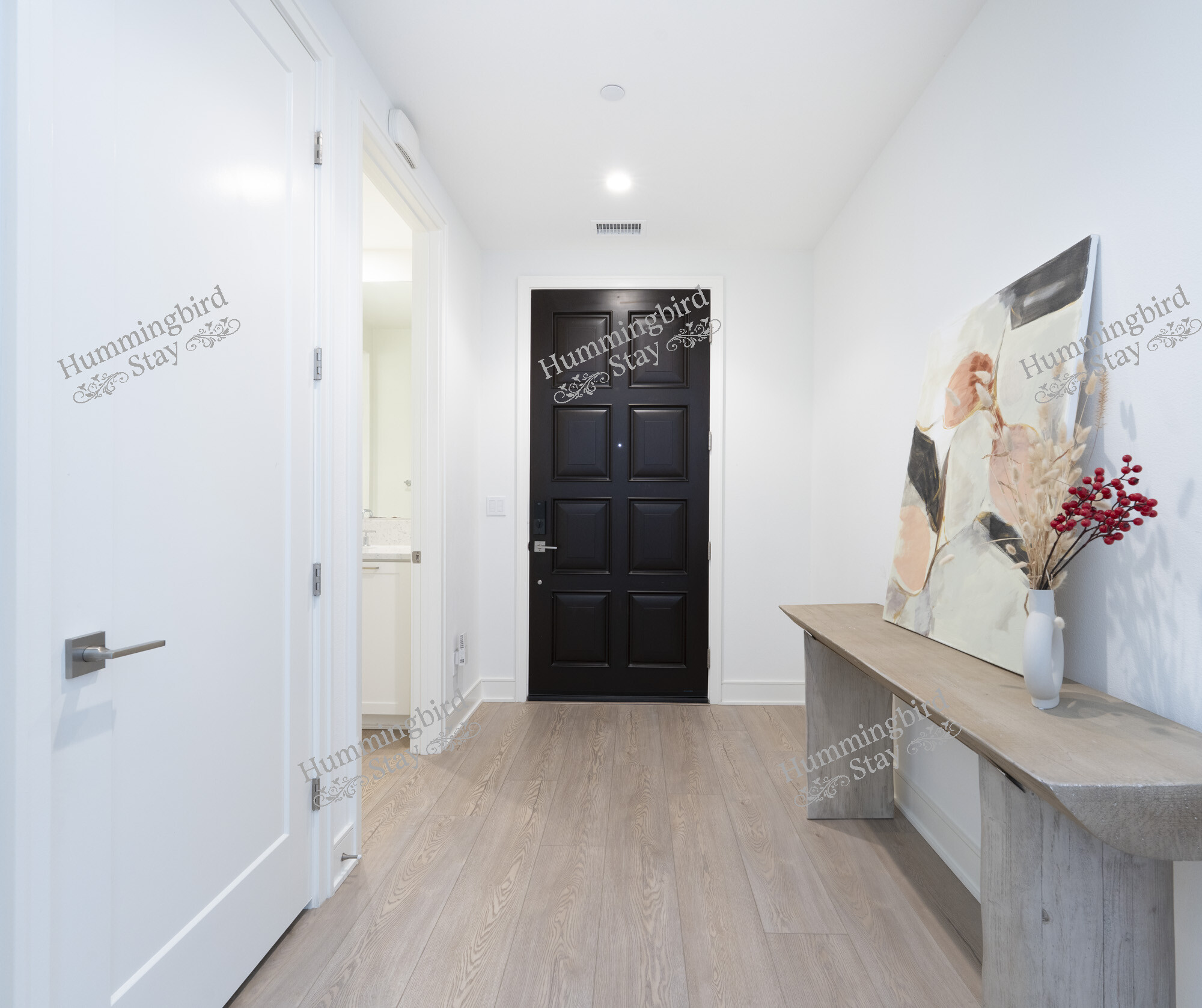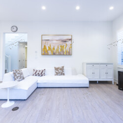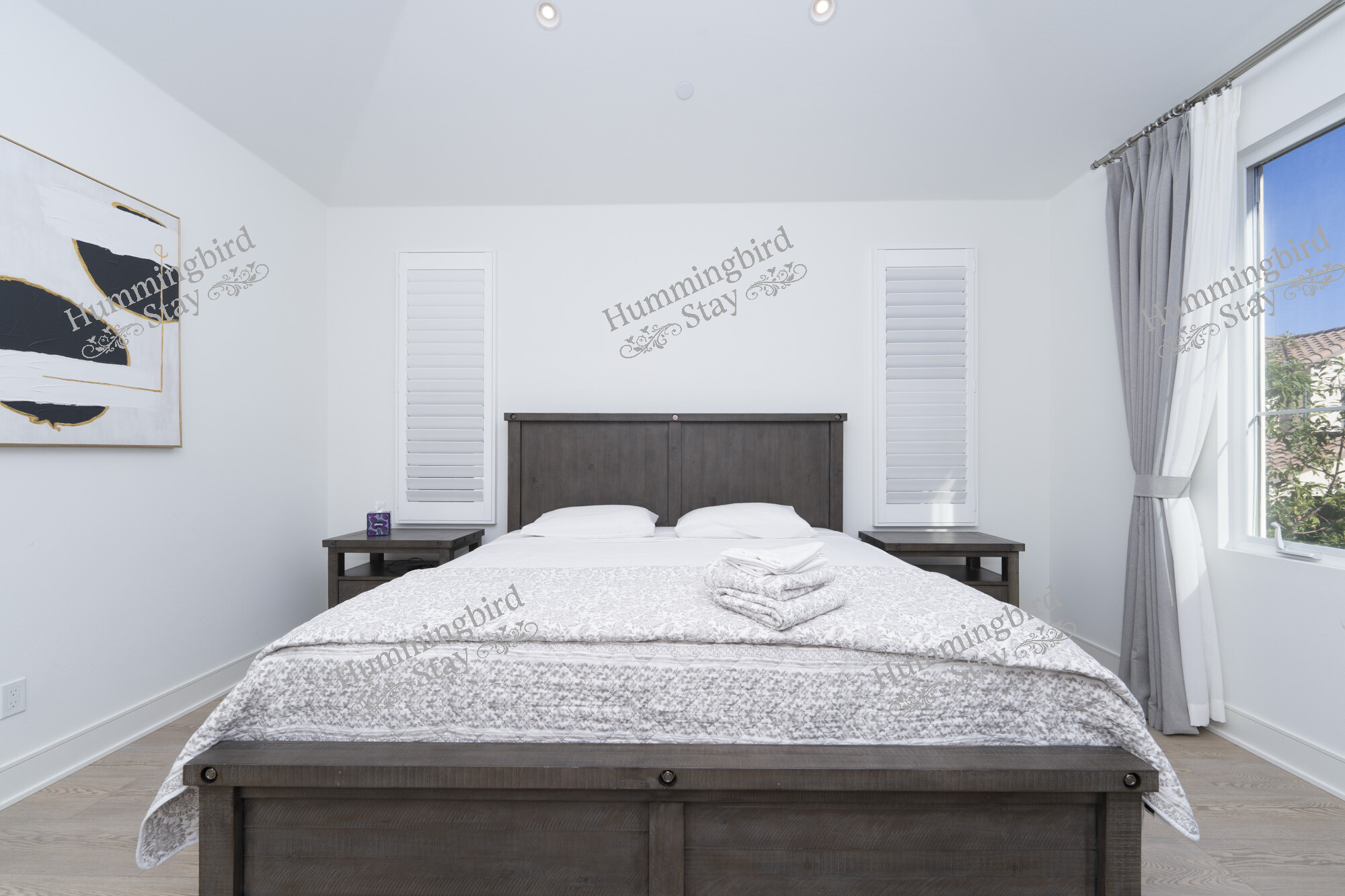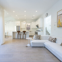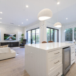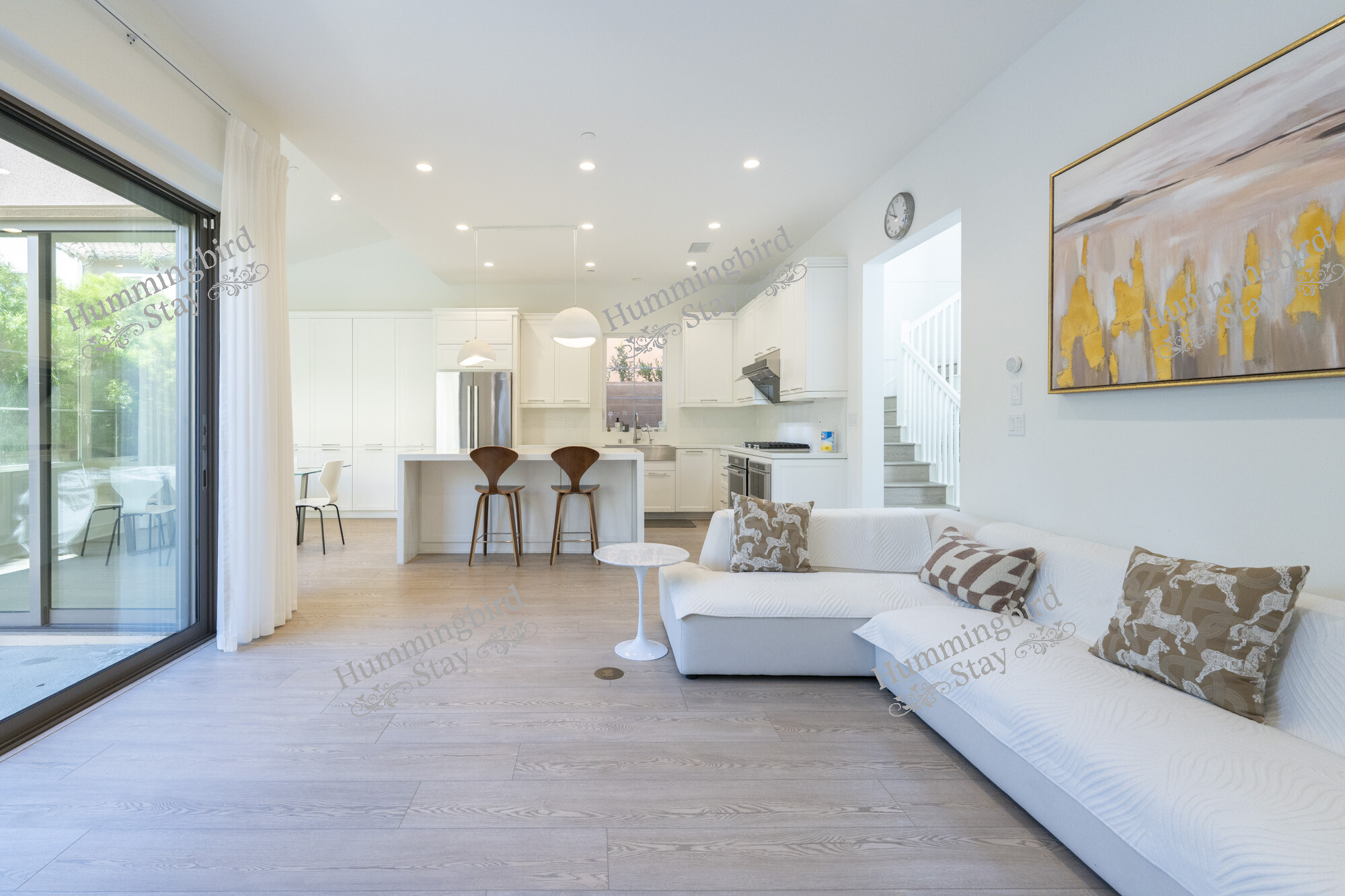 Open-Concept Great Room — Step through the striking black panel front door into a sun-drenched living area anchored by wide-plank whitewashed hardwood floors, recessed LED lighting, and white plantation shutters throughout. A plush white sectional with mid-century modern accent chairs invites you to settle in, while black-framed sliding glass doors open to a private patio — blurring the line between indoors and out. The color palette is intentionally restful: crisp whites, warm taupes, and walnut wood accents that carry from room to room.