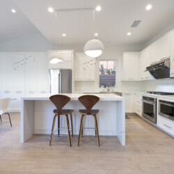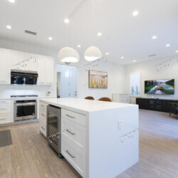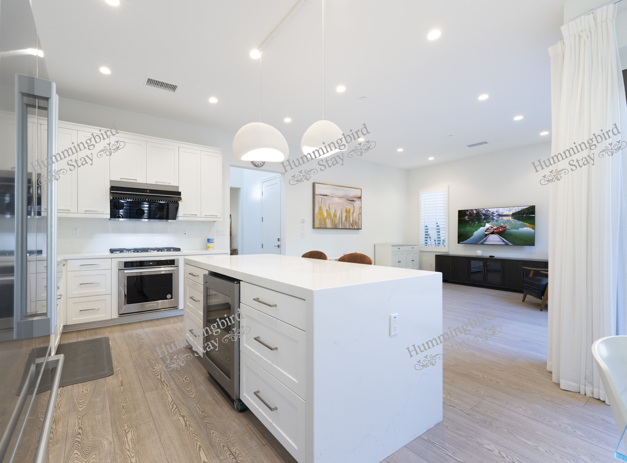 The heart of this home is a chef-ready kitchen with a large waterfall-edge white quartz island, two walnut Cherner-style counter stools, and a pair of white dome pendant lights overhead. The professional-grade appliance suite includes a 5-burner gas cooktop, KitchenAid wall oven and microwave drawer, stainless steel French-door refrigerator, and a built-in wine cooler tucked into the island. Full-height white Shaker cabinetry with brushed nickel hardware lines every wall, and the quartz countertops continue as a seamless backsplash — clean, durable, and refined.