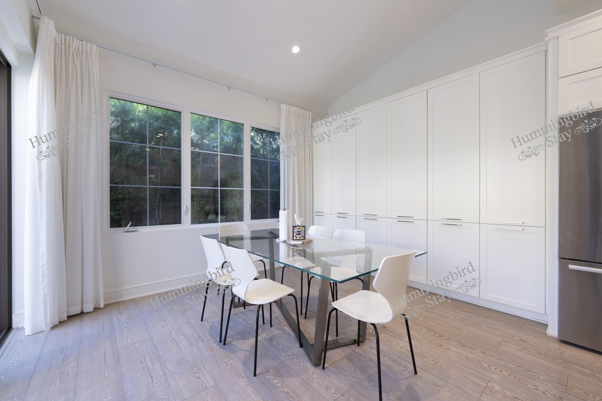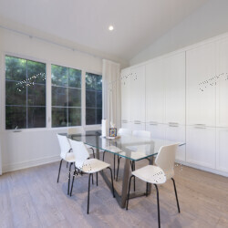 Dining Area — A modern glass-top dining table seats six beneath colonial-grid windows that frame views of mature landscaping. Floor-to-ceiling white pantry cabinetry lines the adjacent wall, offering generous storage.