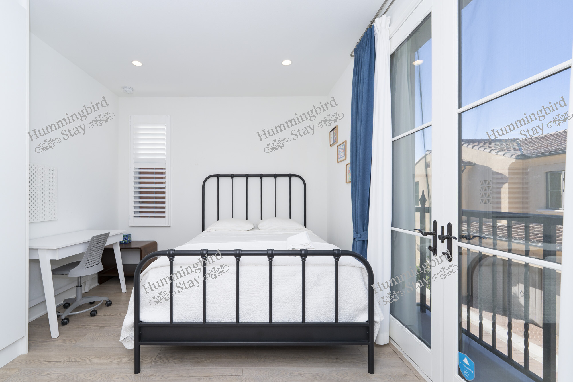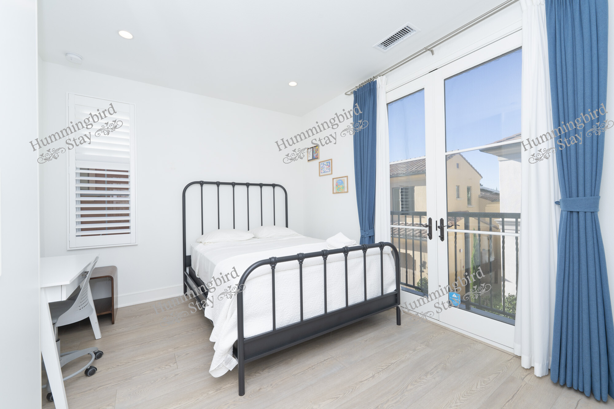 Second Bedroom — A bright room with French doors opening to a private Juliet balcony, dressed with ocean-blue curtains and furnished with a desk and workspace — ideal for remote work or a growing family.