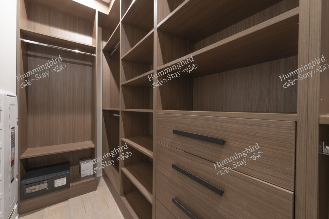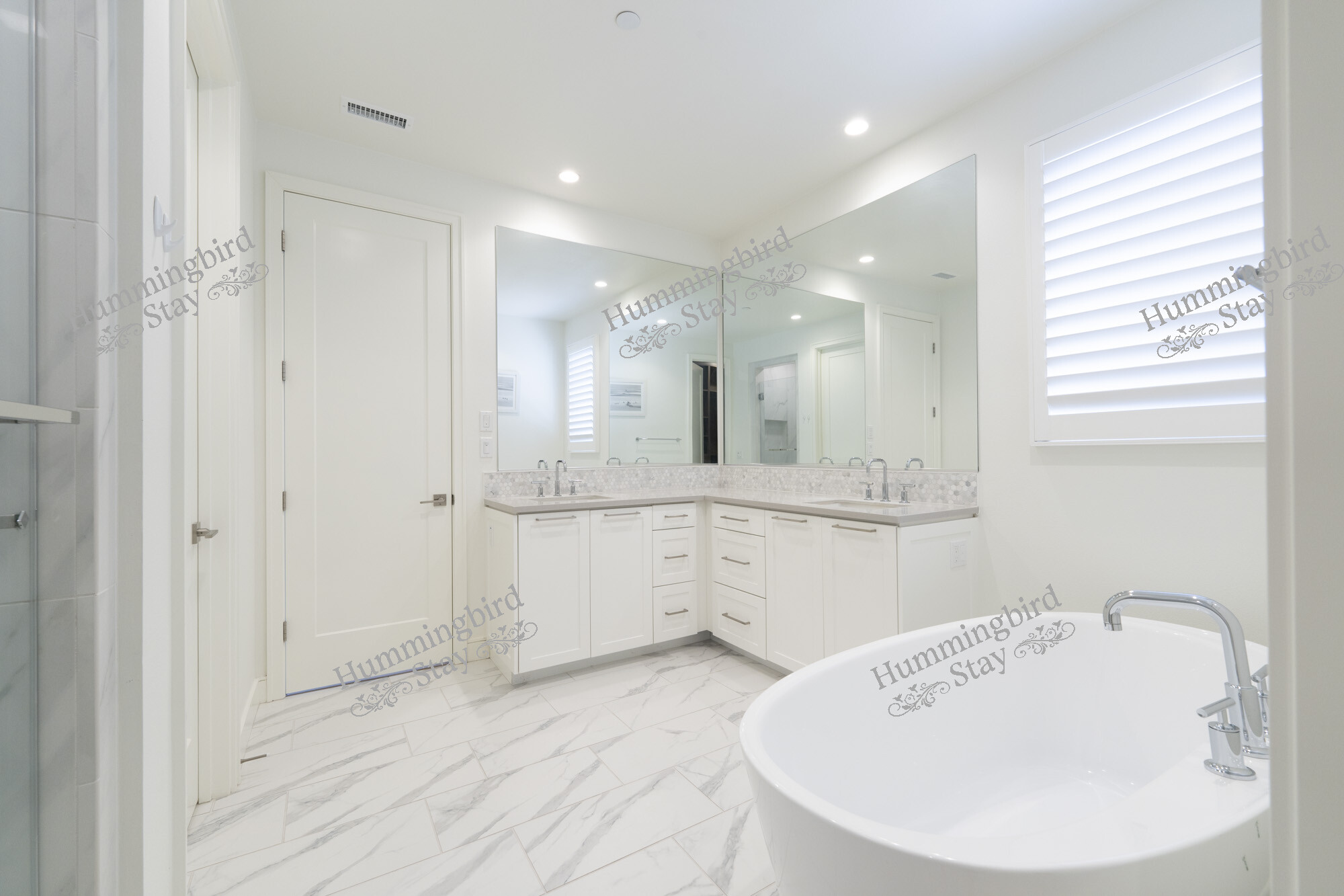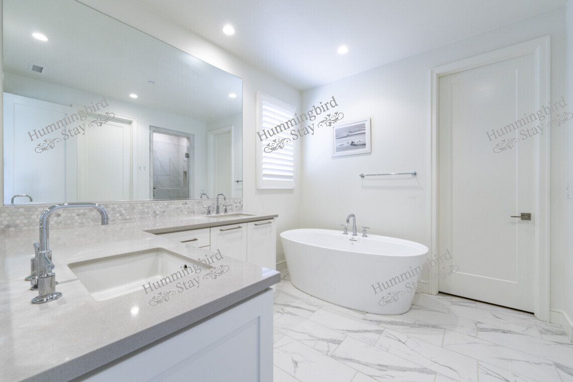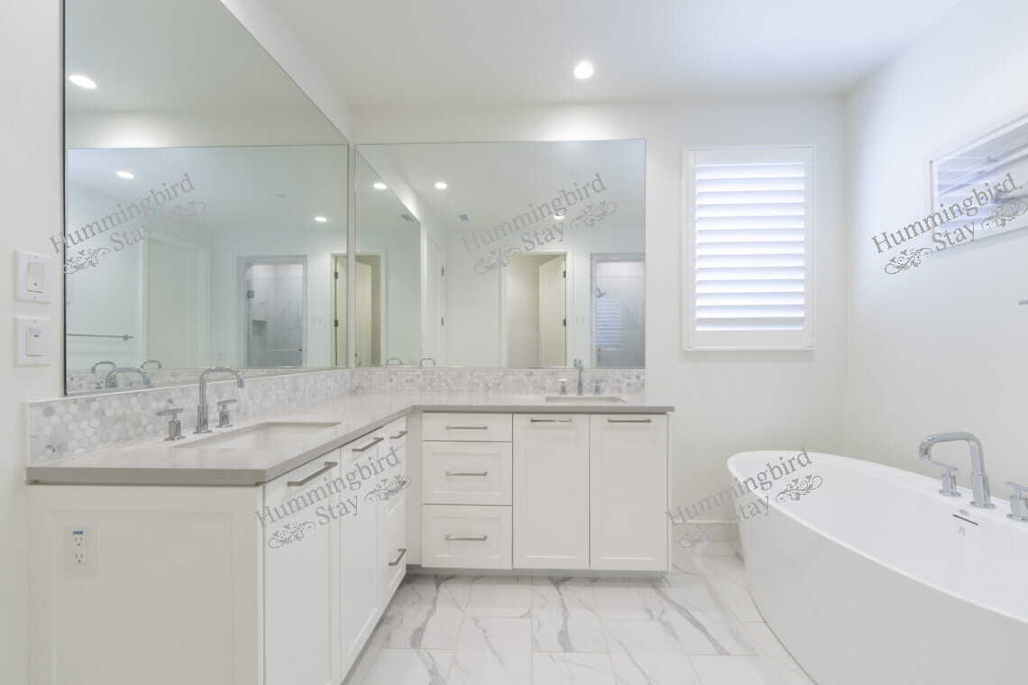 Primary Suite — A king-size retreat with vaulted ceilings and large windows overlooking the rolling green hills of Loma Ridge. The adjoining spa-style primary bath features a freestanding oval soaking tub, a walk-in frameless glass shower with rain showerhead and built-in niches, dual vanities with hexagonal marble mosaic backsplash, and Calacatta marble-look porcelain tile throughout. A custom walk-in closet in warm walnut-toned cabinetry with integrated LED lighting, pull-out racks, and an in-room safe completes the suite.