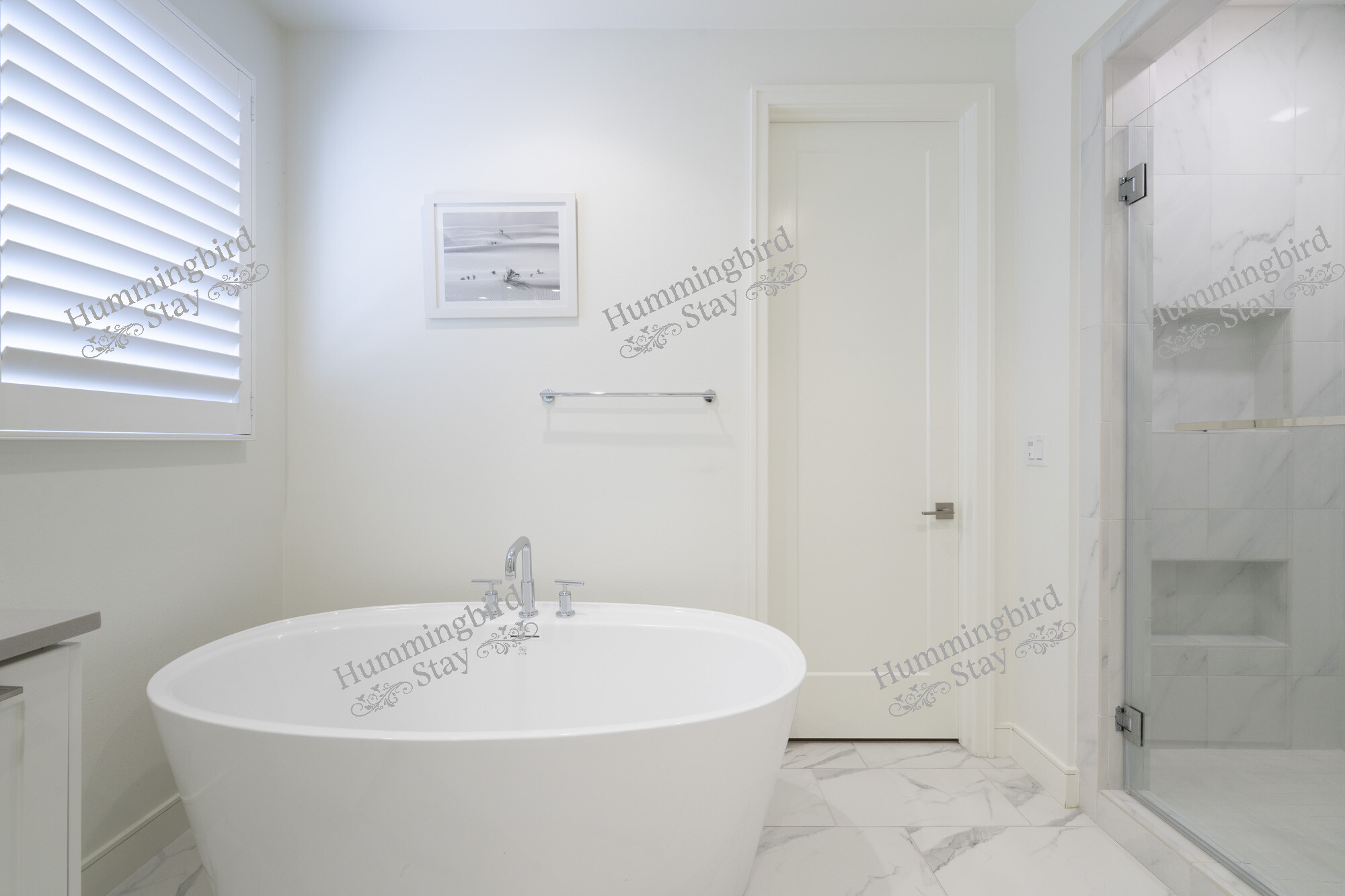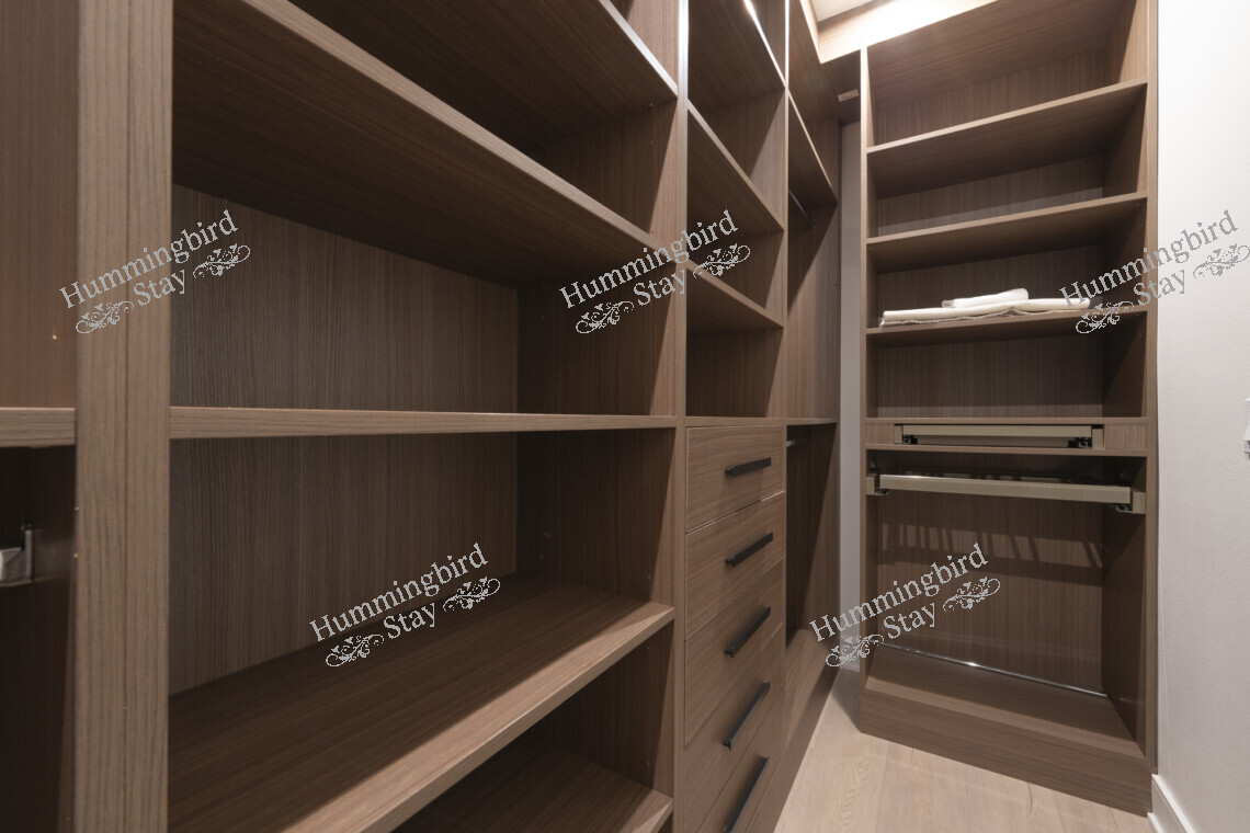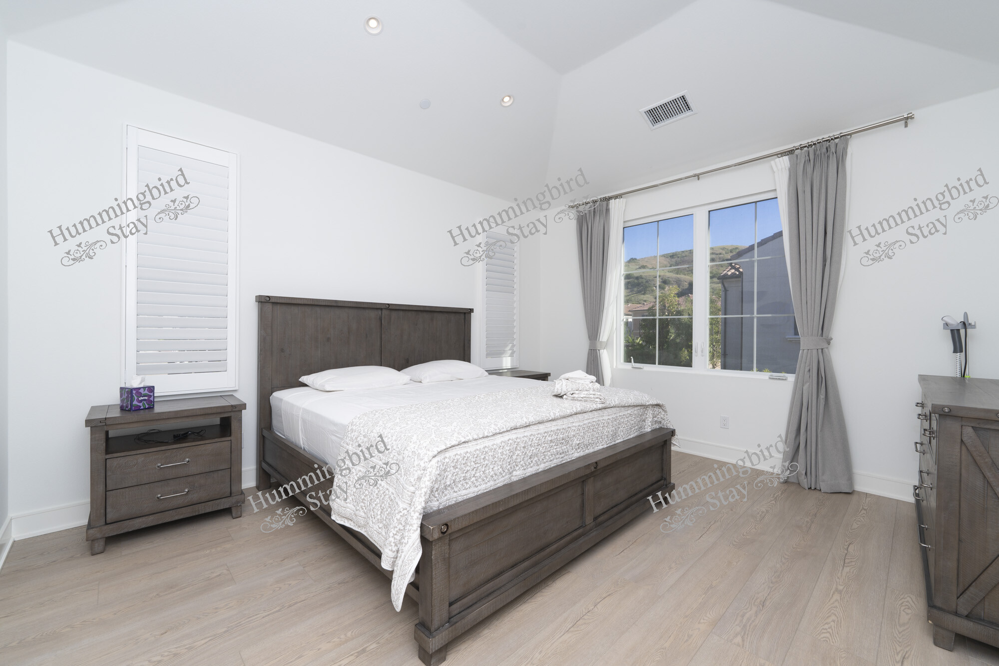 Primary Suite — A king-size retreat with vaulted ceilings and large windows overlooking the rolling green hills of Loma Ridge. The adjoining spa-style primary bath features a freestanding oval soaking tub, a walk-in frameless glass shower with rain showerhead and built-in niches, dual vanities with hexagonal marble mosaic backsplash, and Calacatta marble-look porcelain tile throughout. A custom walk-in closet in warm walnut-toned cabinetry with integrated LED lighting, pull-out racks, and an in-room safe completes the suite.