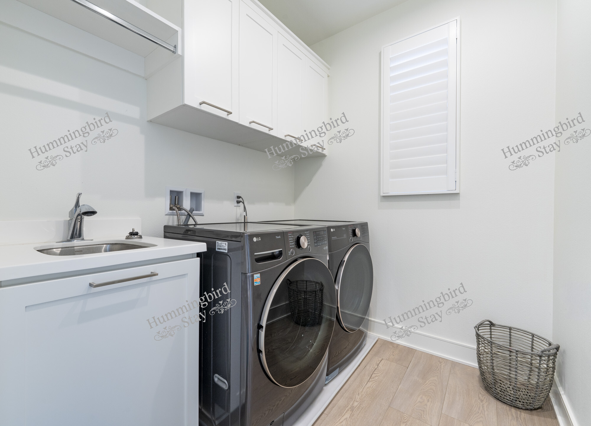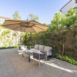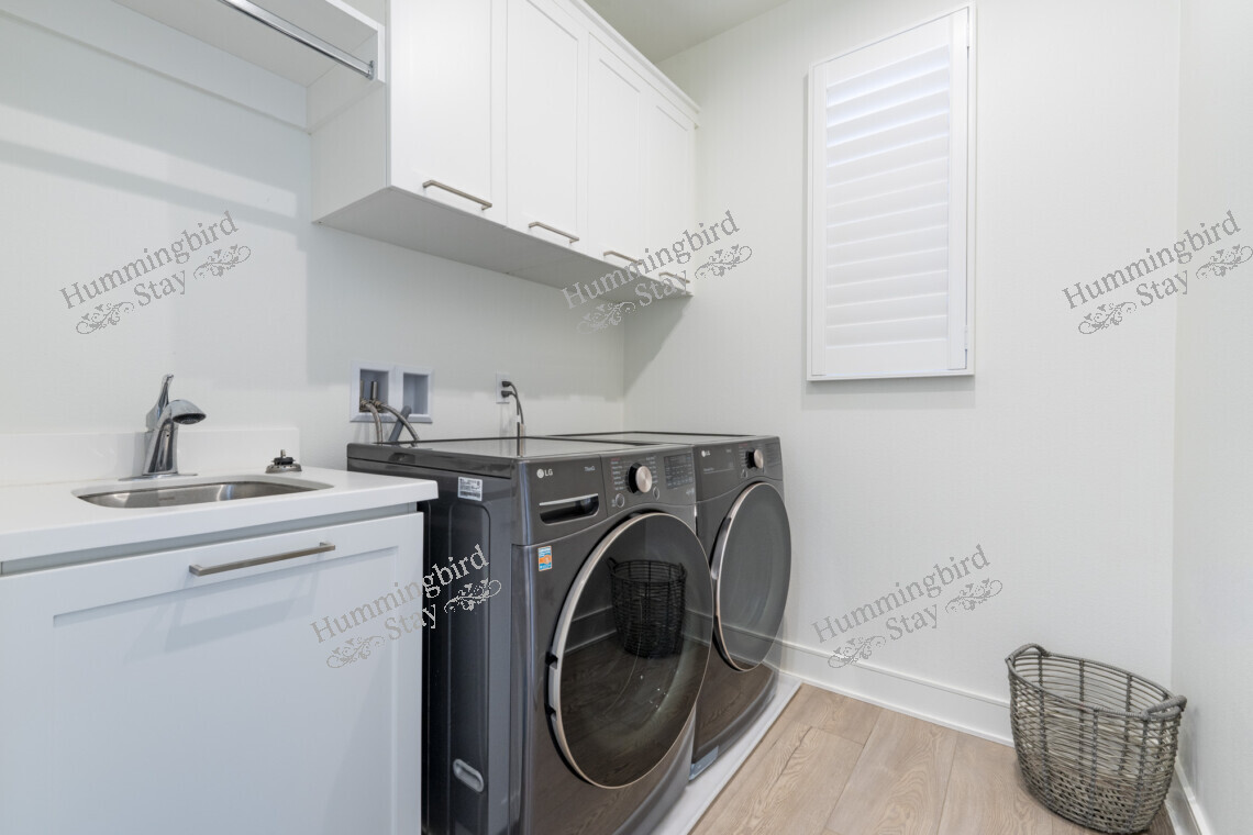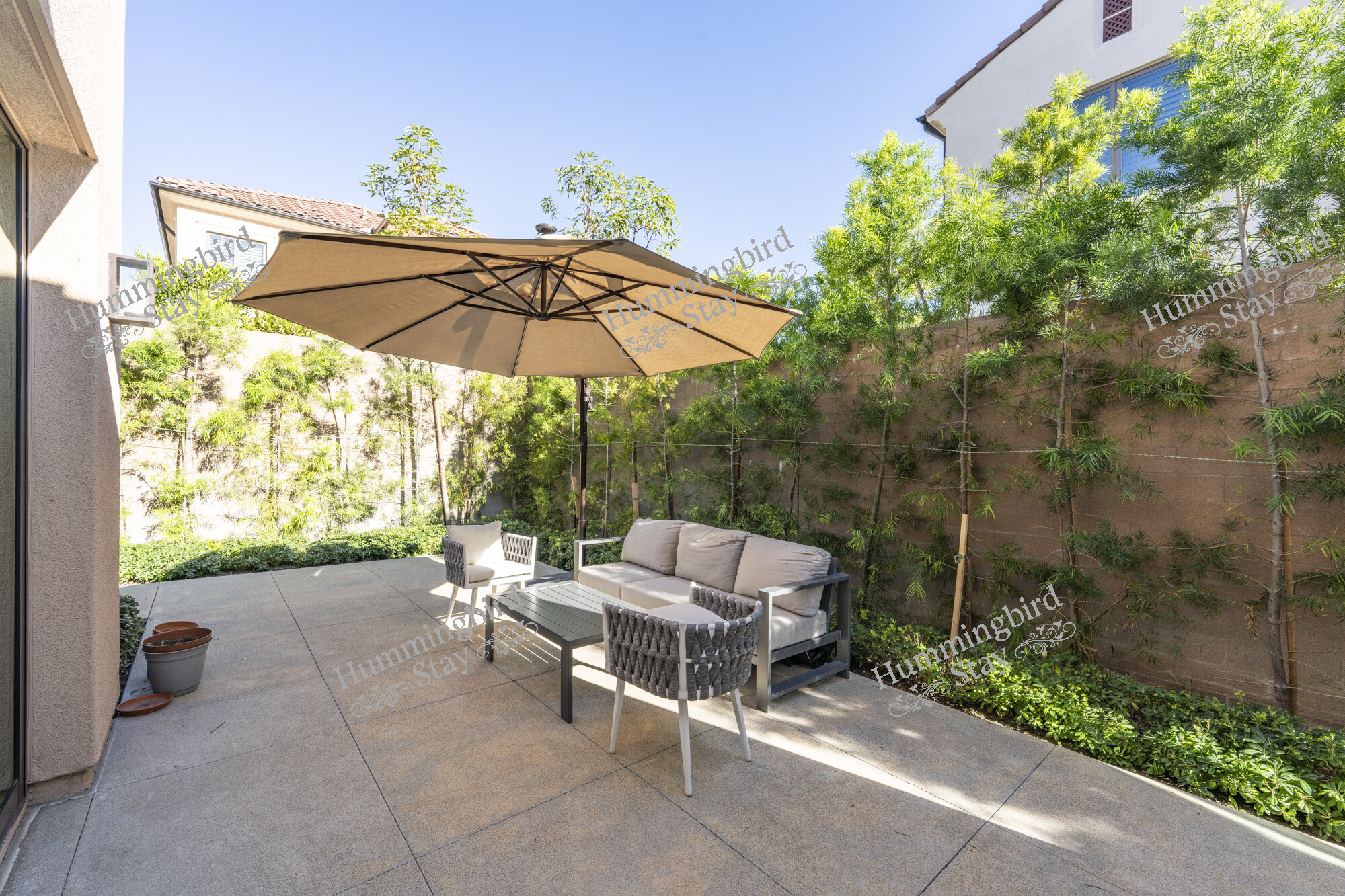 The private courtyard patio is wrapped in mature podocarpus and bamboo screening for complete privacy. Contemporary outdoor seating with woven rope detailing and a cantilever umbrella make this the perfect space for morning coffee or evening wine. Inside, a dedicated laundry room with LG front-loading washer and dryer, utility sink, upper cabinetry, and a hanging rod keeps everything organized.