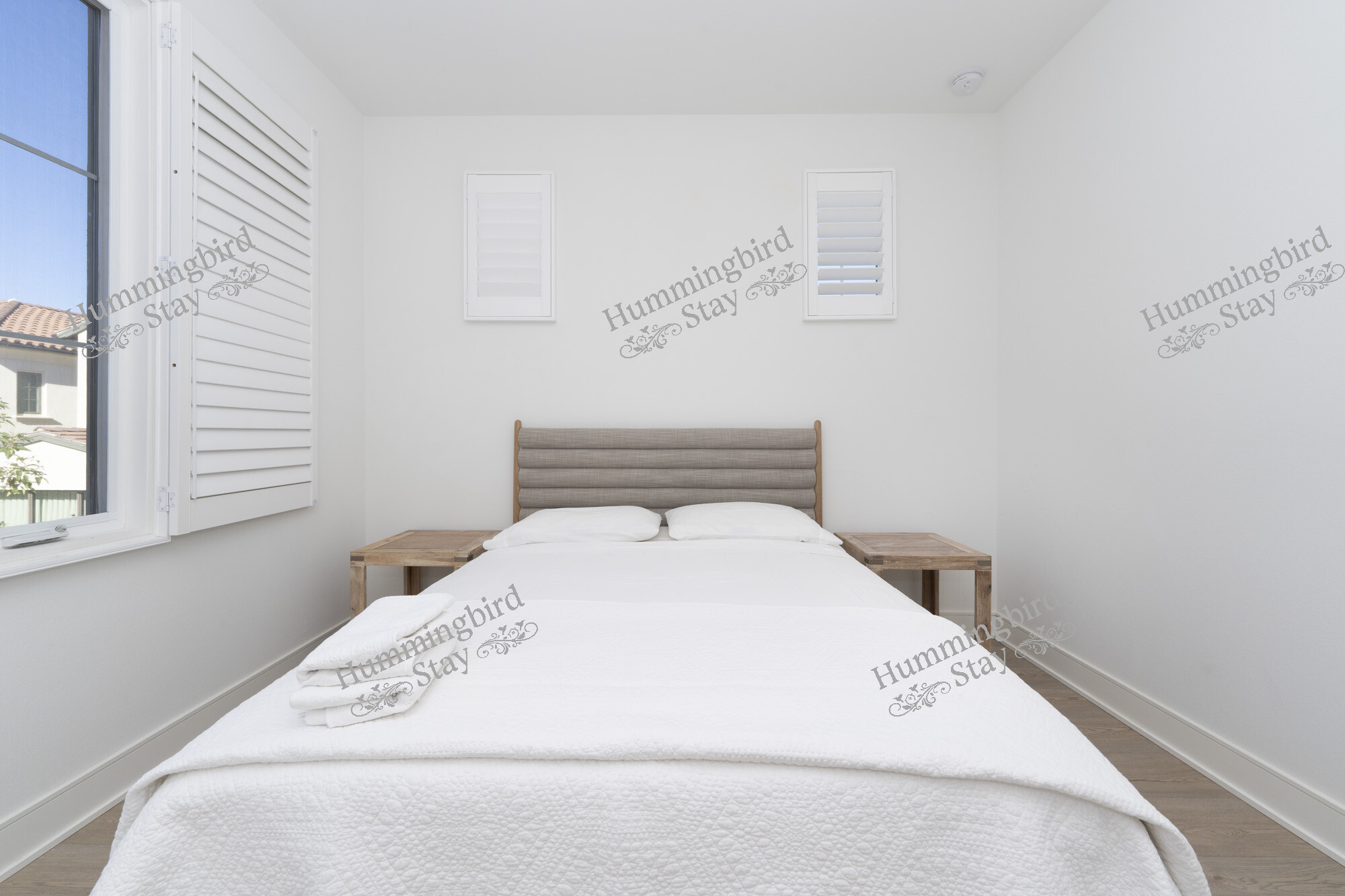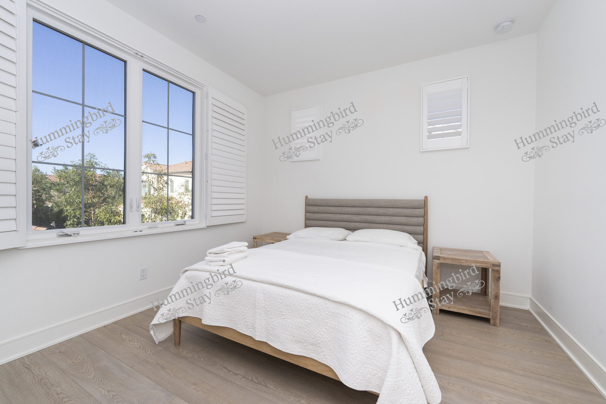 Third Bedroom — A serene guest room with a channel-tufted linen headboard, natural wood nightstands, and views of the community’s Mediterranean-inspired architecture. Both secondary bedrooms share a well-appointed full bath with dual vanities, walk-in glass-enclosed shower, and a floor-to-ceiling linen tower.