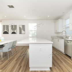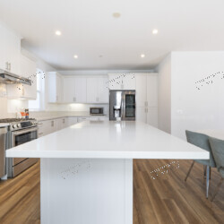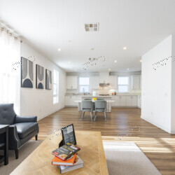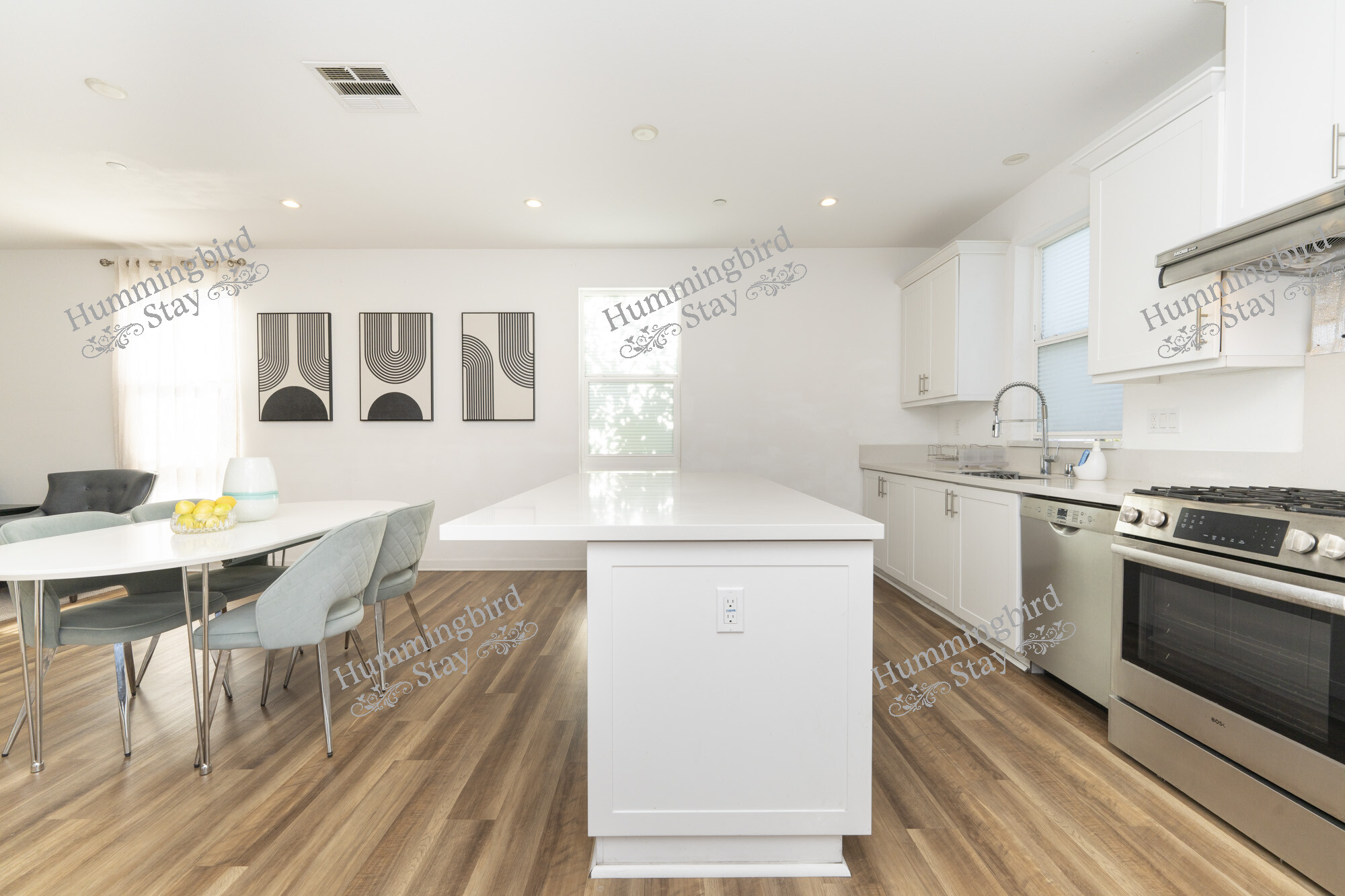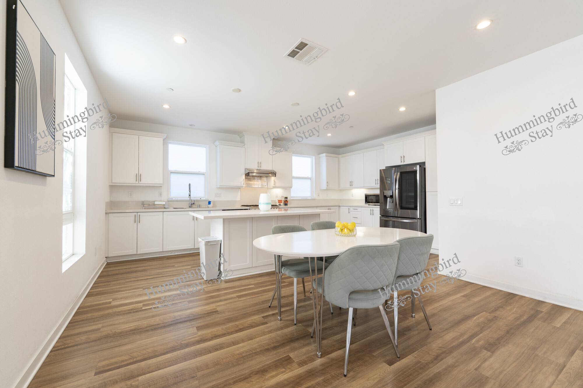 Spanning 1,940 sq ft across three levels, this 4-bedroom, 3.5-bathroom townhome delivers the space and style of a single-family home with the ease of condo living. The open-concept main level features a chef’s kitchen with white shaker cabinetry, quartz countertops, a gas range with stainless steel hood, and a French-door refrigerator with ice dispenser. The breakfast bar flows seamlessly into the dining area — furnished with a sleek oval table and sage velvet chairs — and on to the generous living room.